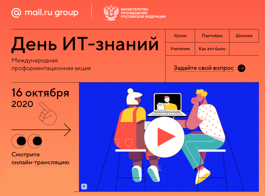 16 октября 2020 г. международная профориентационная акция «День ИТ-знаний – 2020» (далее – Акция) в формате интерактивного урока-презентации, урока-дискуссии между специалистом ИТ-отрасли и обучающимися 8-9 классов школ субъектов Российской Федерации в режиме онлайн-связи.
