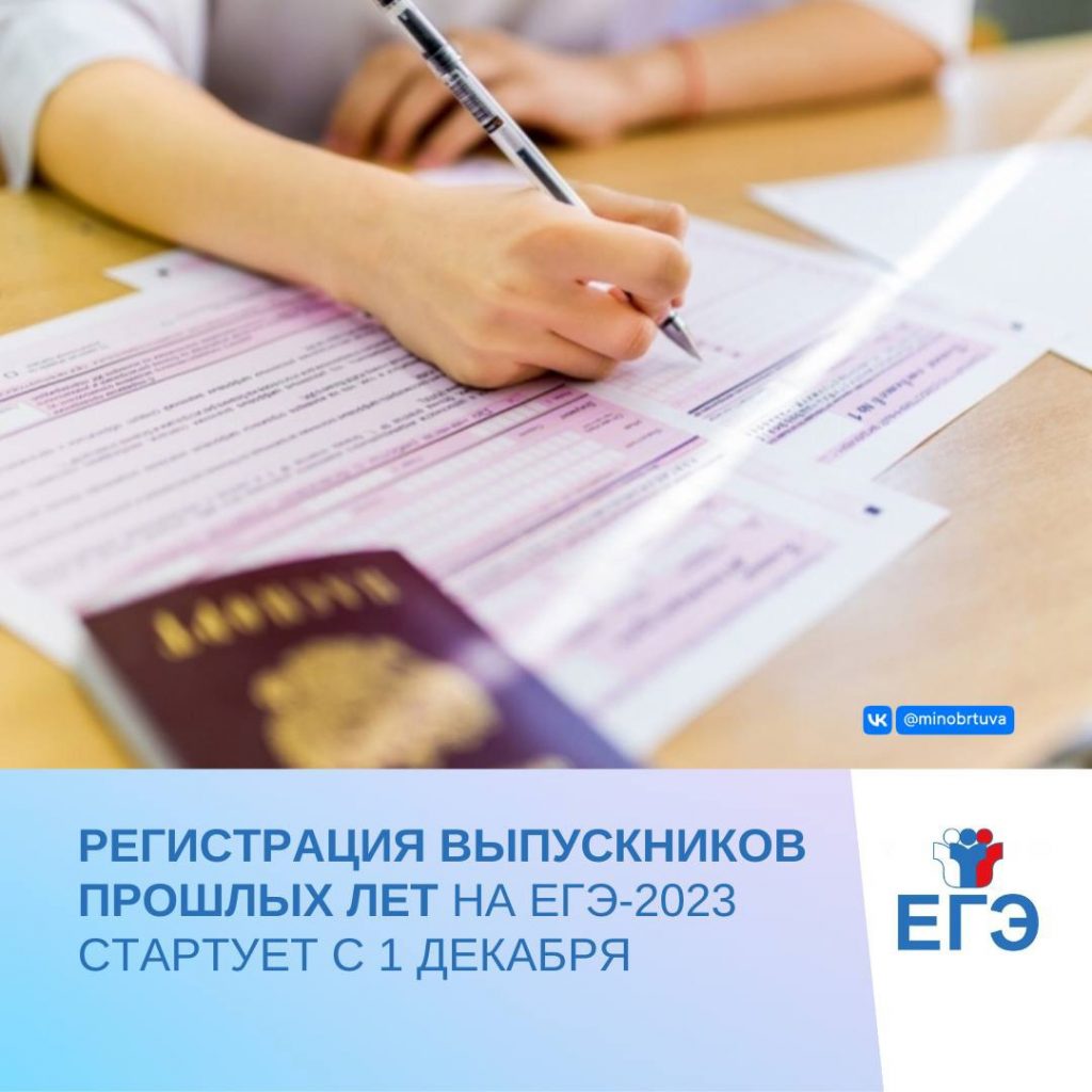 Министерство образования Республики Тыва информирует выпускников прошлых лет (далее — ВПЛ), что регистрация на ЕГЭ начинается с 1 декабря 2022 года. Заявление на участие в ЕГЭ подаётся до 1 февраля 2023 года (включительно).