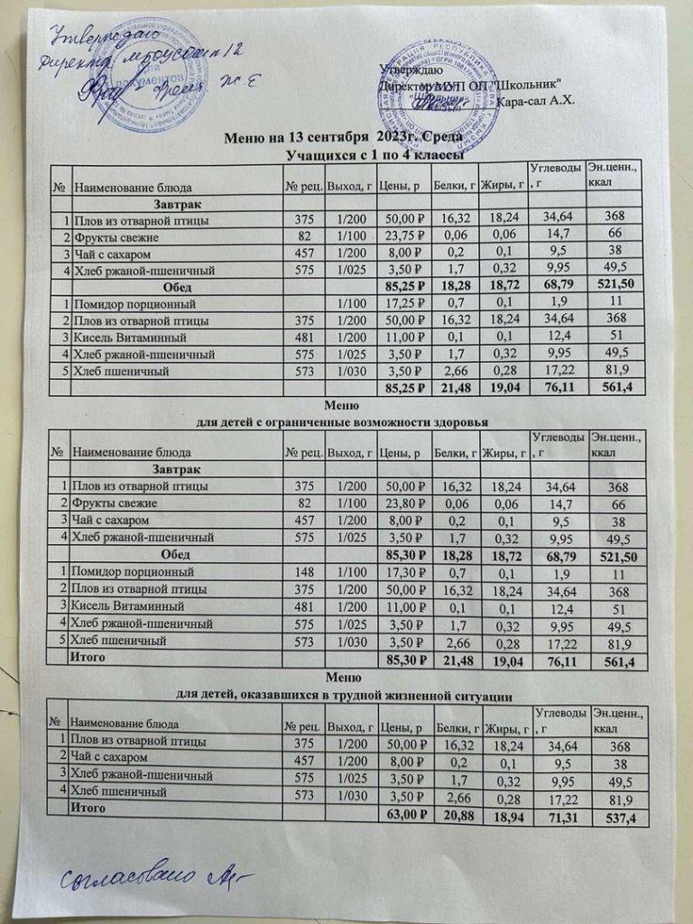 Меню на 13 сентября
