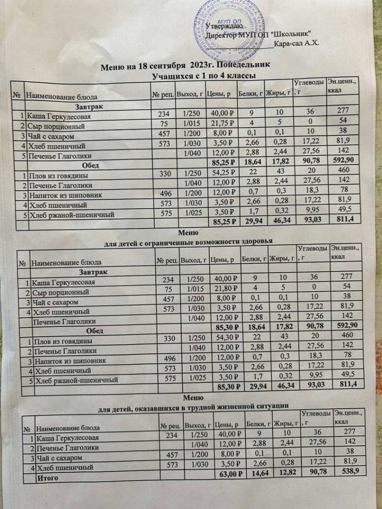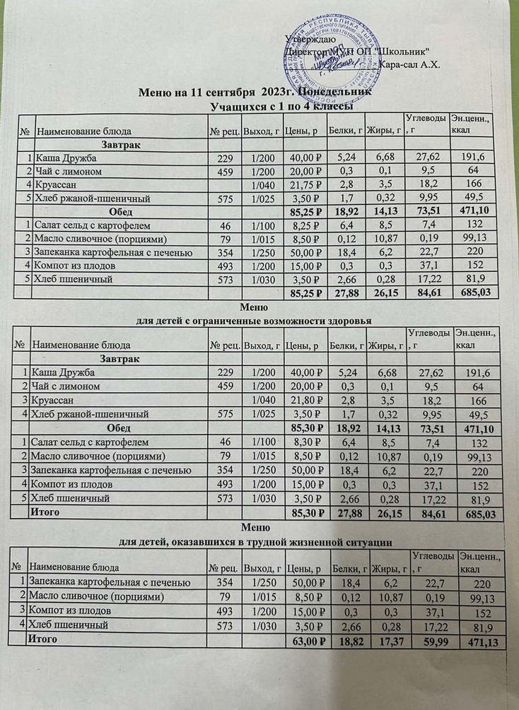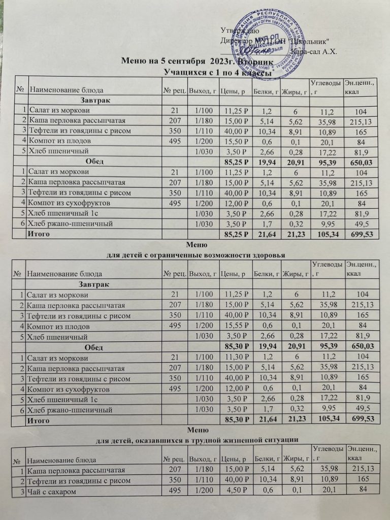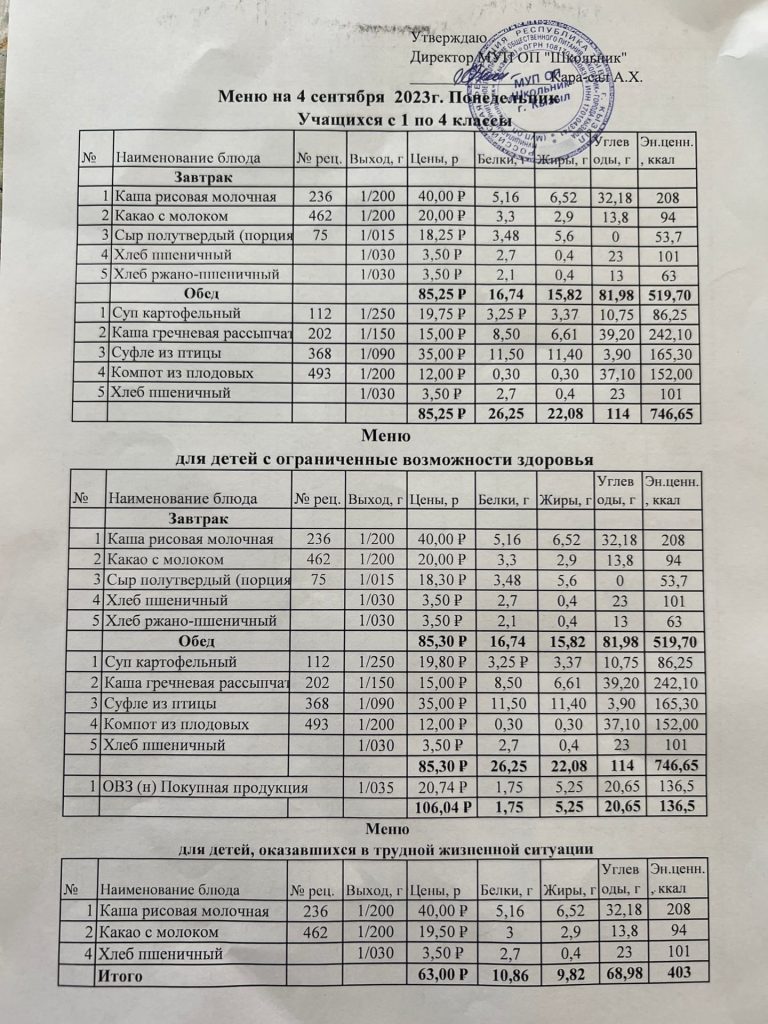 Меню на 4 сентября