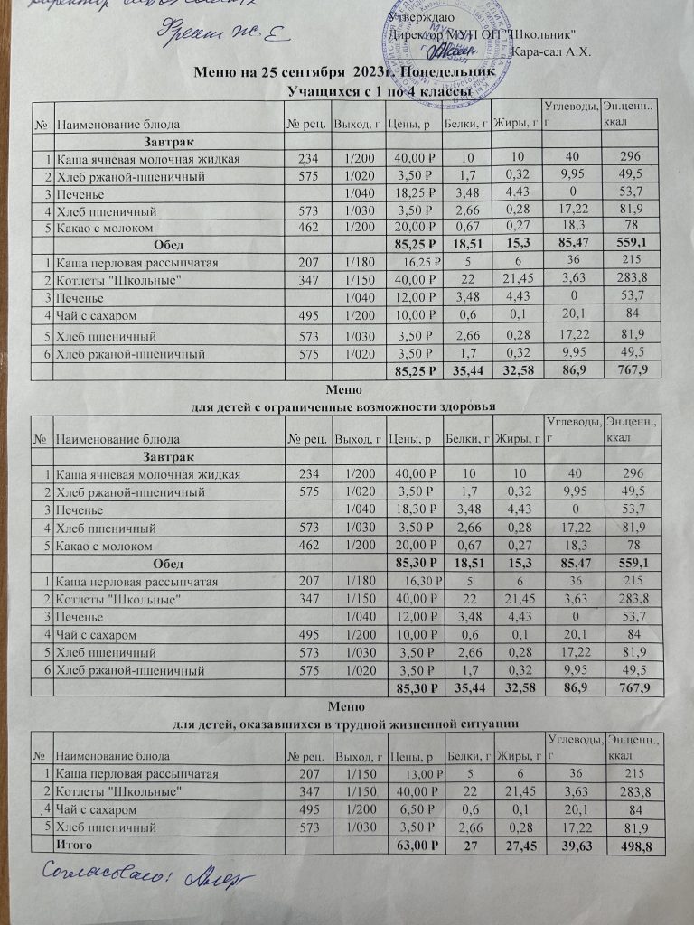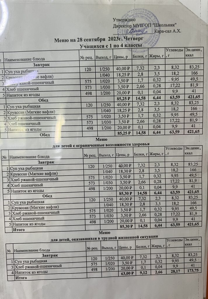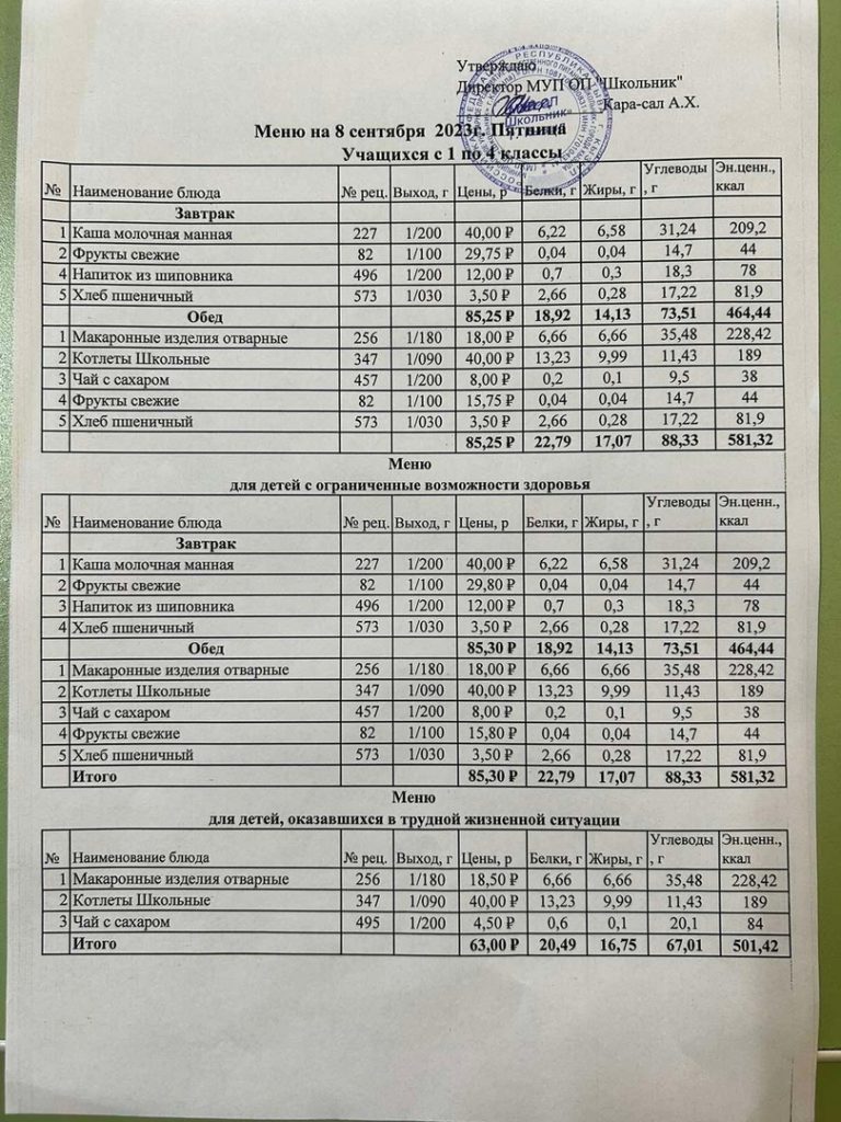 Меню на сентябрь 2023