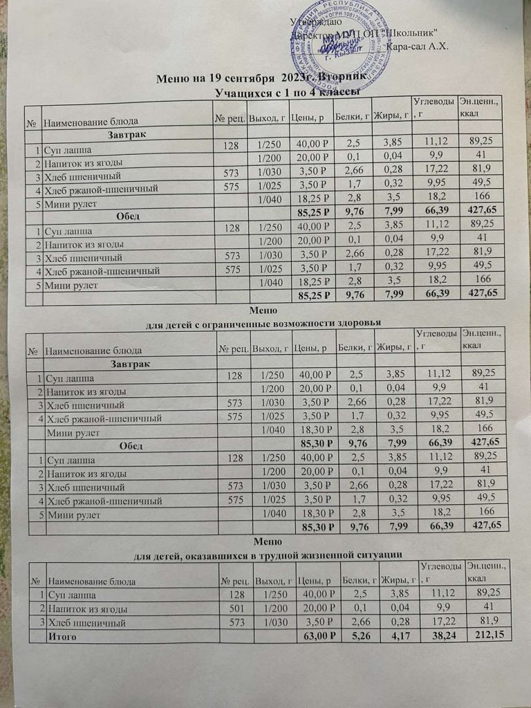Меню на 19 сентября