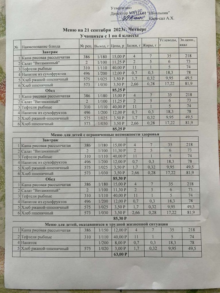 Меню на 21 сентября