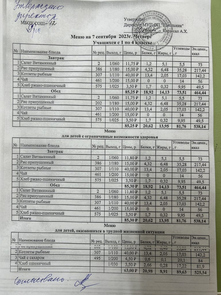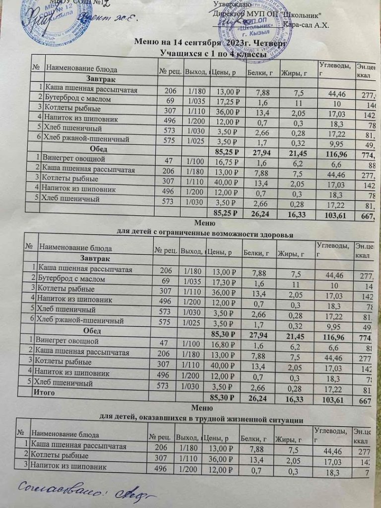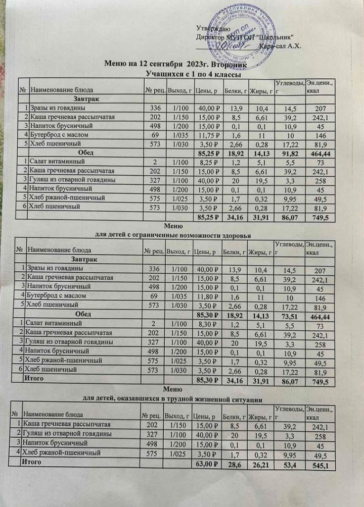 Меню на 12 сентября