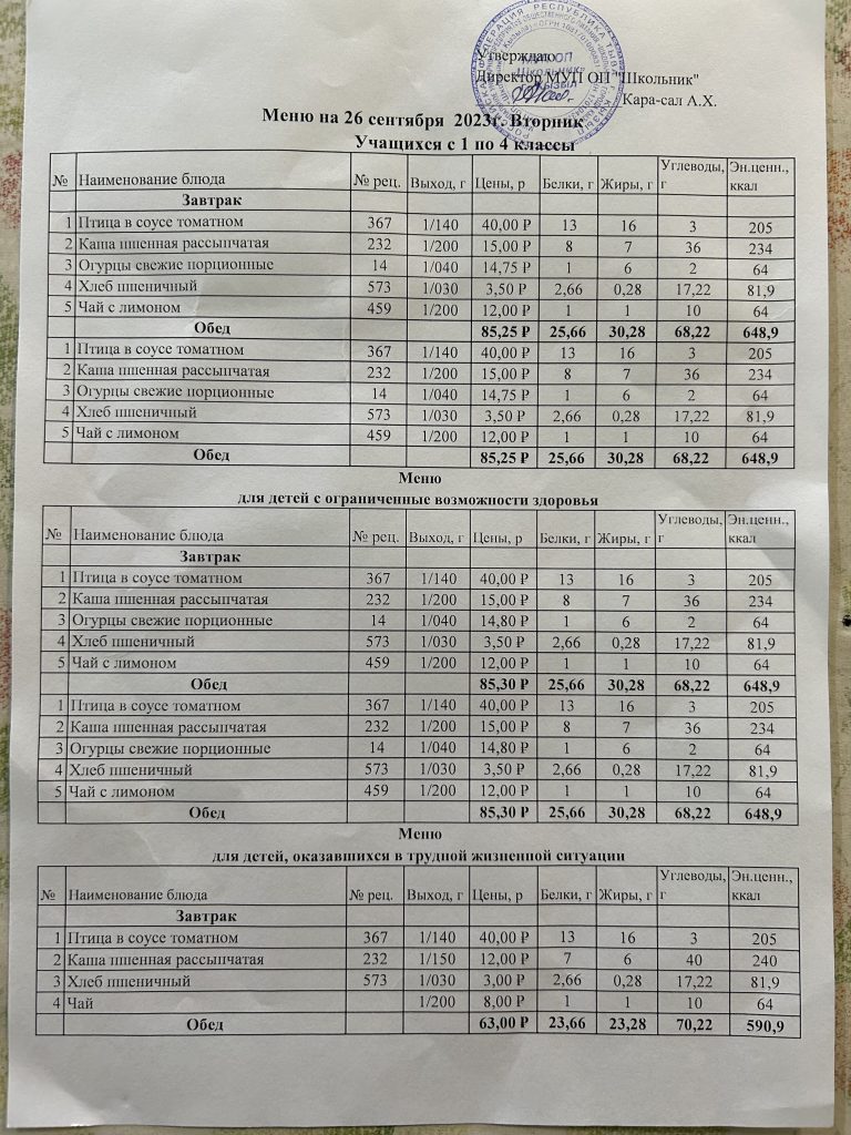 Меню на 26 сентября