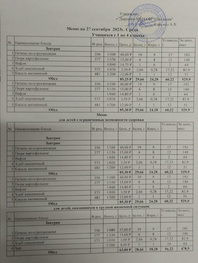 Меню на 27 сентября