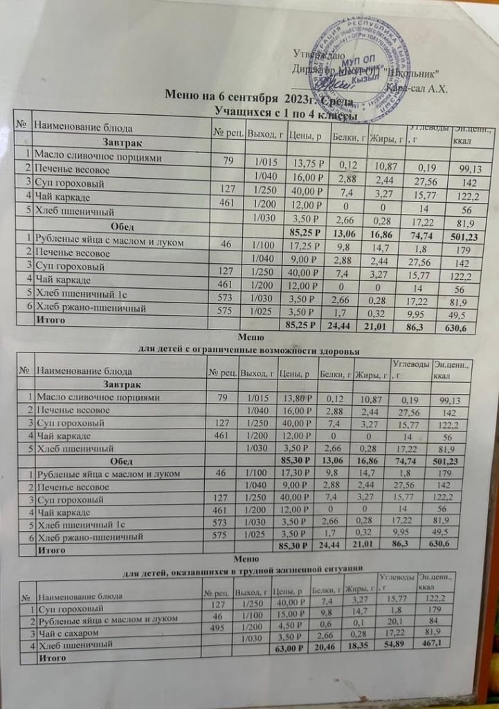 Меню на 6 сентября
