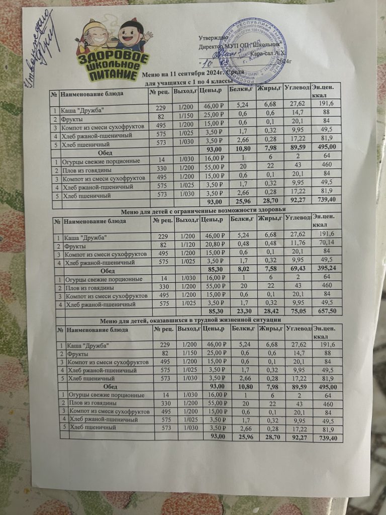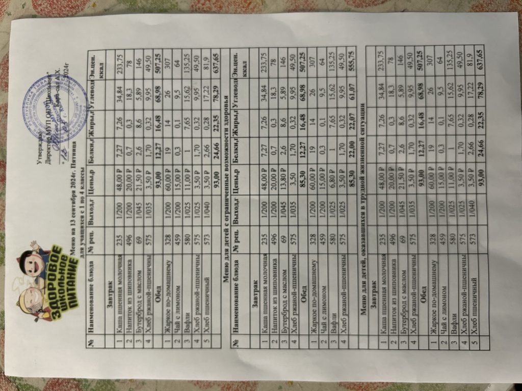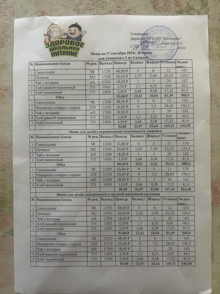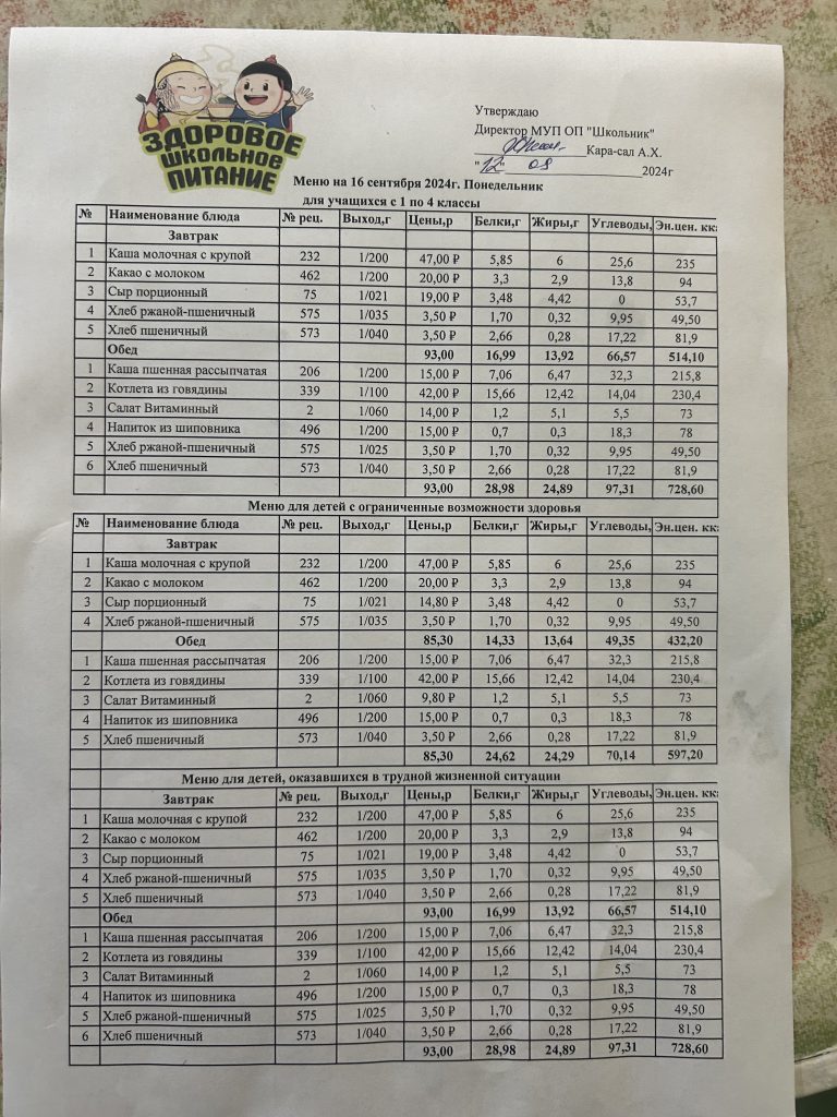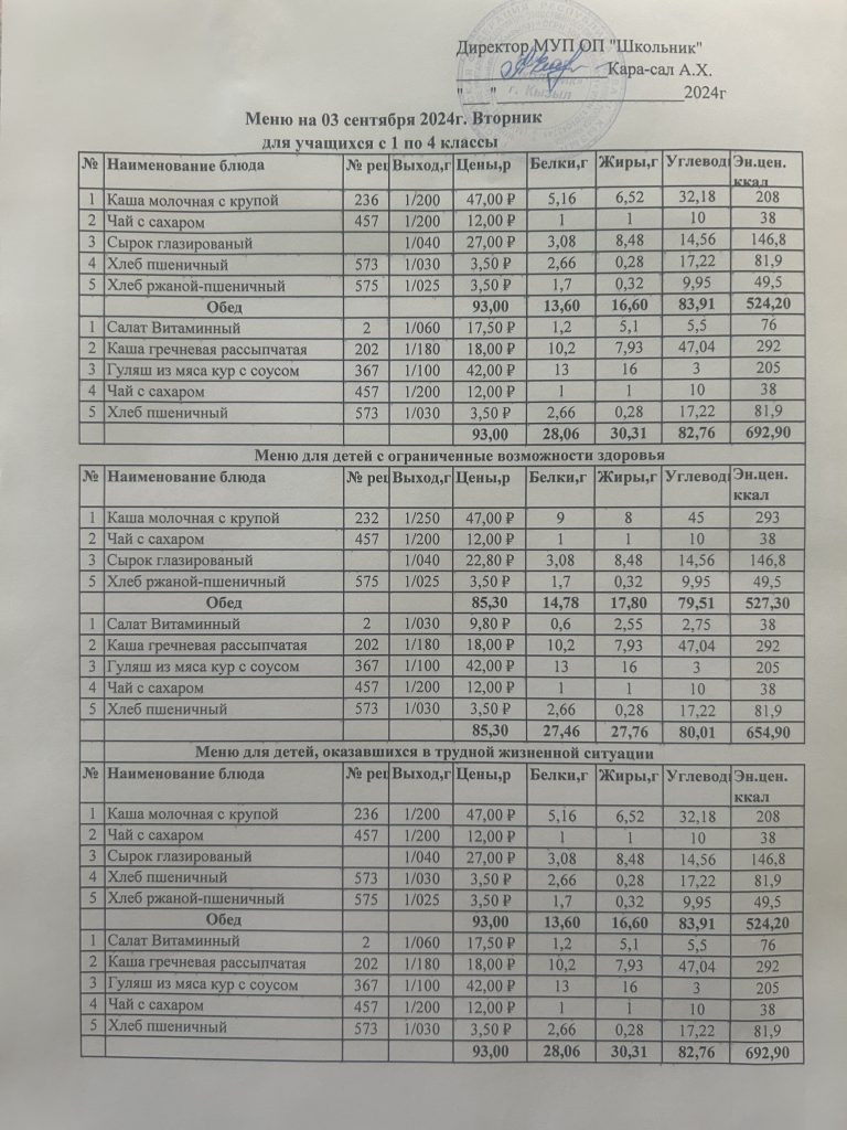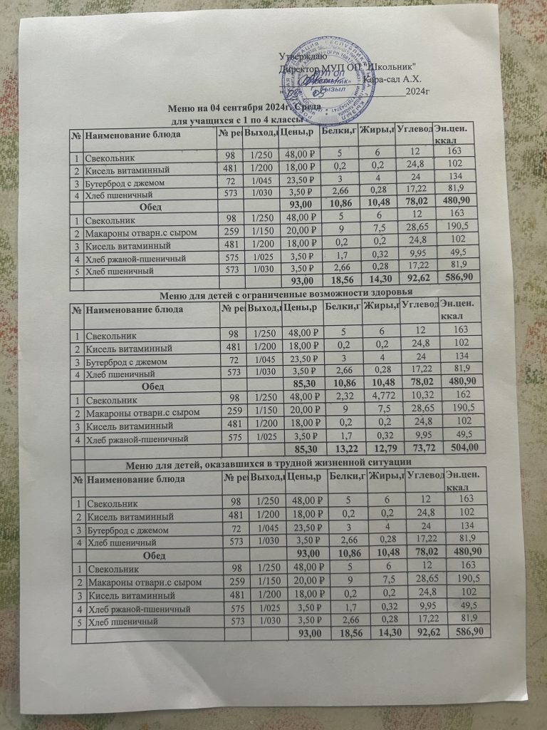 Меню на 4 сентября