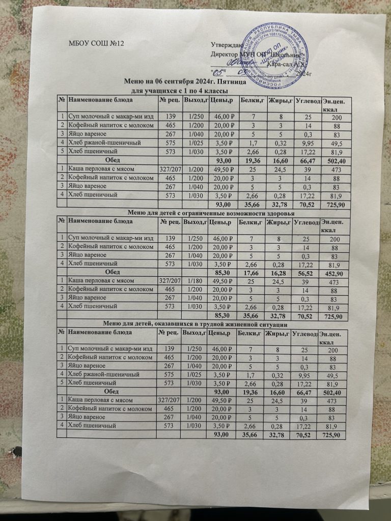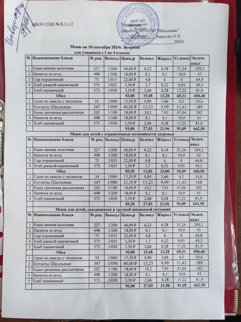 Меню на 12 сентября