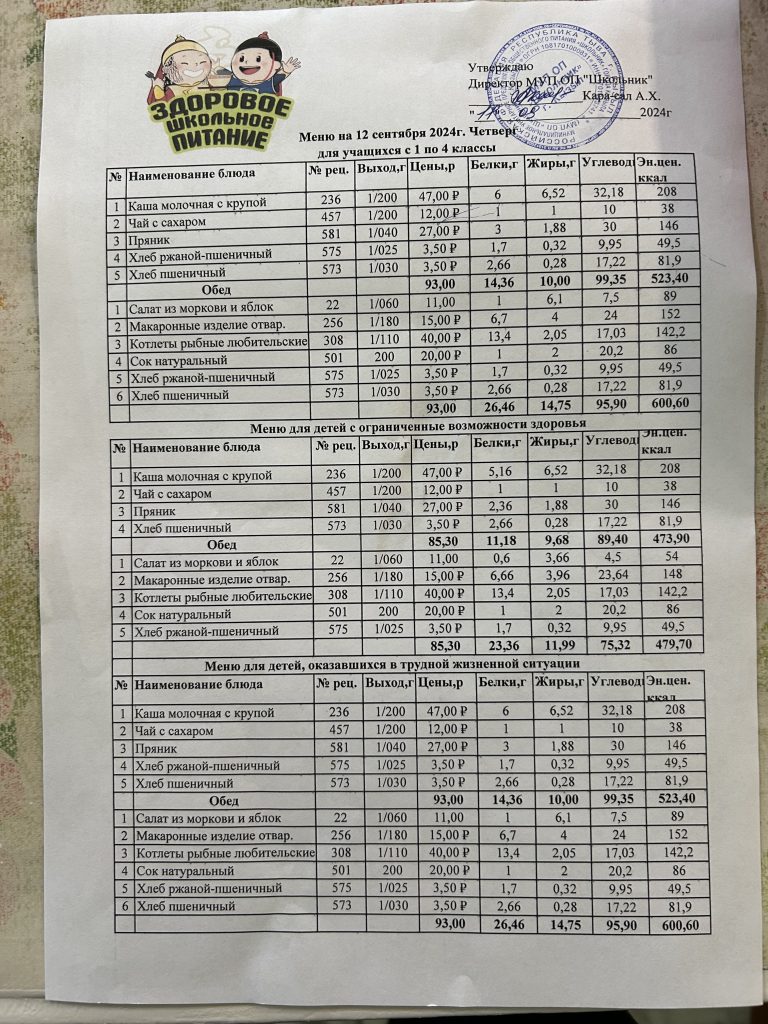 Меню на сентябрь 2024